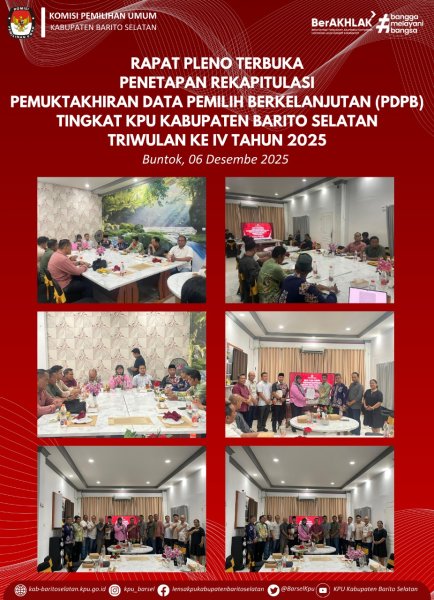 Buntok,KPU Barsel - KPU Kabupaten Barito Selatan Melaksanakan Rapat Pleno Terbuka Penetapan Rekapitulasi Daftar Pemilih Berkelanjutan Triwulan II Tahun 2025 Tingkat Kabupaten Barito Selatan yang dilaksanakan di Kantor KPU kab. Barito Selatan, 02/07/2025. Dengan jumlah Kecamatan sebanyak 6 dan jumlah Kelurahan / Desa sebanyak 93, jumlah pemilih Laki - Laki 50.024 dan Jumlah pemilih Perempuan 48.418 total jumlah data pemilih berkelanjutan (PDPB) di Kabupaten Barito Selatan Berjumlah 98.442.