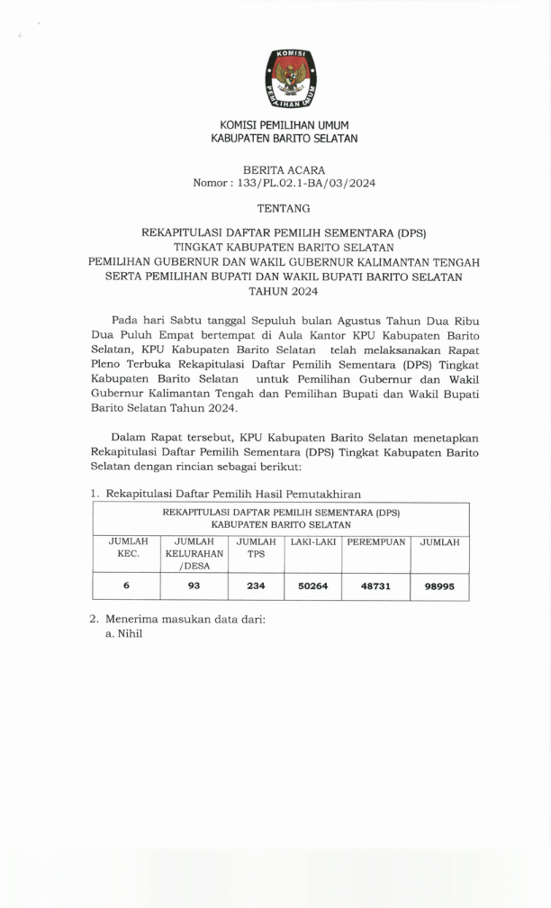 BERITA ACARA TENTANG REKAPITULASI DAFTAR PEMILIH SEMENTARA (DPS] PILKADA 2024 Senin, 19 Agustus 2024 07:00 1095 Selengkapnya. . . . KLIK DISINI Bagikan: Telah dilihat 1,095 kali