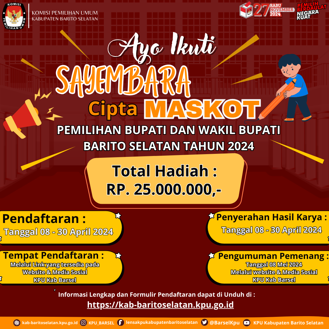 6. Pemberian hadiah pemenang akan diserahkan saat launching Pemilihan Bupati dan Wakil Bupati Kabupaten Barito Selatan Tahun 2024