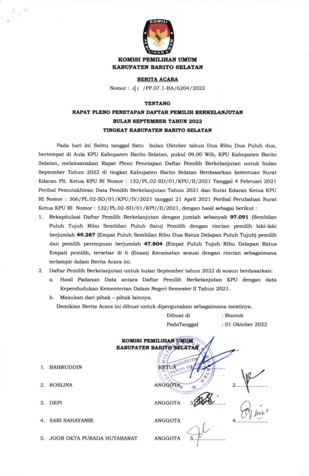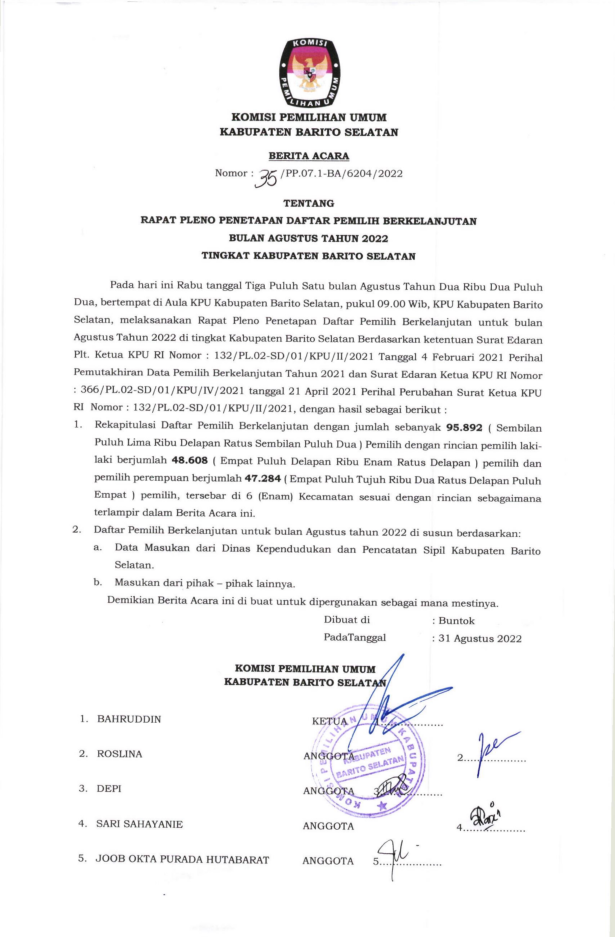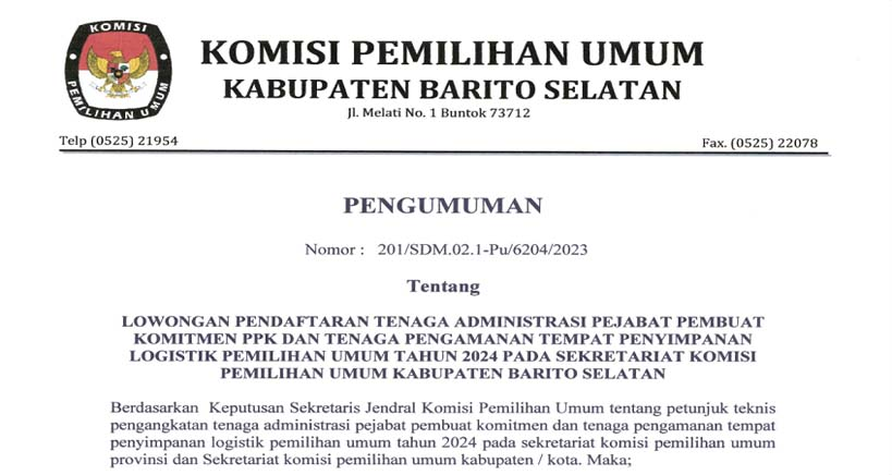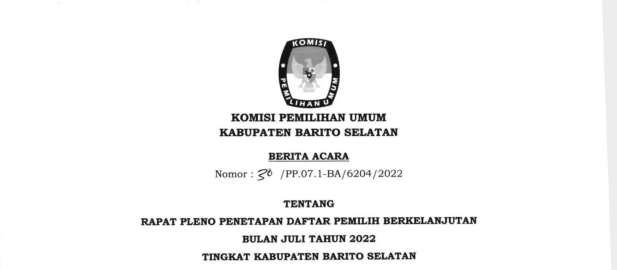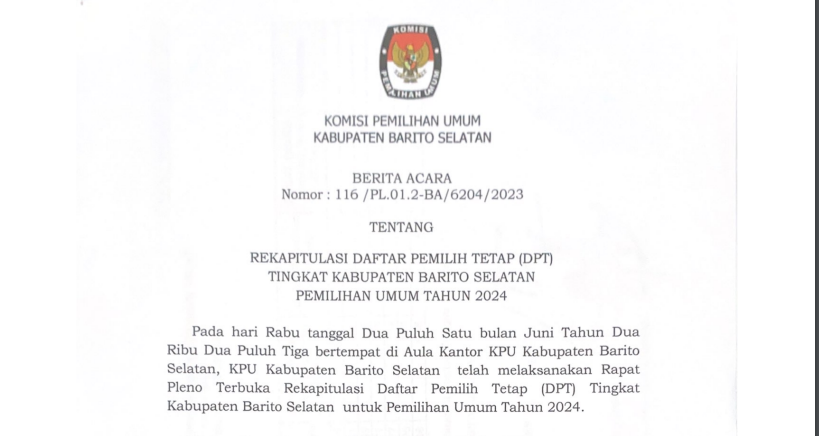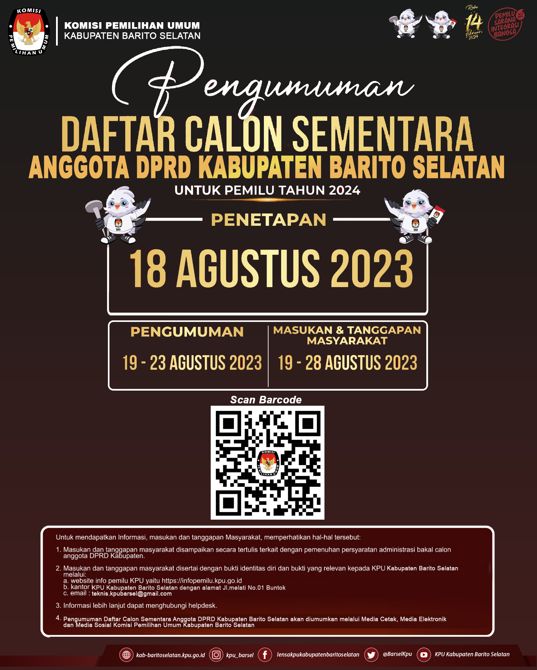 KPU Barsel - PENGUMUMAN NOMOR 485/PL.01.4-Pu/6204/2023 TENTANG DAFTAR CALON SEMENTARA ANGGOTA DPRD KABUPATEN/KOTA BARITO SELATAN DALAM PEMILIHAN UMUM TAHUN 2024 Bahwa untuk melaksanakan ketentuan Pasal 70 Peraturan KPU Nomor 10 Tahun 2023 tentang Pencalonan Anggota Dewan Perwakilan Rakyat, Dewan Perwakilan Rakyat Daerah Provinsi, dan Dewan Perwakilan Rakyat Daerah Kabupaten/Kota, KPU Kabupaten/Kota BARITO SELATAN mengumumkan Daftar Calon Sementara (DCS) Anggota DPRD Kabupaten/Kota BARITO SELATAN dan persentase keterwakilan perempuan dalam Daftar Calon Sementara (DCS) sebagaimana terlampir. Berkenaan dengan hal tersebut, sesuai dengan ketentuan Pasal 71 Peraturan KPU Nomor 10 Tahun 2023 tentang Pencalonan Anggota Dewan Perwakilan Rakyat, Dewan Perwakilan Rakyat Daerah Provinsi, dan Dewan Perwakilan Rakyat Daerah Kabupaten/Kota, bahwa masyarakat dapat menyampaikan masukan dan tanggapan terhadap calon sementara Anggota DPR, DPRD provinsi, dan DPRD kabupaten/kota yang tercantum dalam Daftar Calon Sementara (DCS) dari tanggal 19 - 28 Agustus 2023. MODEL PENGUMUMAN.DCS.DPRD KAB/KOTA Untuk mendapatkan masukan dan tanggapan Masyarakat, memperhatikan hal-hal tersebut: 1. Masukan dan tanggapan masyarakat disampaikan secara tertulis terkait dengan pemenuhan persyaratan administrasi bakal calon anggota DPR, DPRD Provinsi dan DPRD Kabupaten/Kota 2. Masukan dan tanggapan masyarakat disertai dengan bukti identitas diri dan bukti yang relevan kepada KPU Kabupaten/Kota BARITO SELATAN melalui: a. website info pemilu KPU yaitu https://infopemilu.kpu.go.id b. kantor KPU Kabupaten/Kota dengan alamat Jalan Melati No. 01 Buntok c. email : teknis.kpubarsel@gmail.com 3. Informasi lebih lanjut dapat menghubungi helpdesk pencalonan KPU Kabupaten/Kota BARITO SELATAN SELENGKAPNYA >>>> PENGUMUMAN DCS